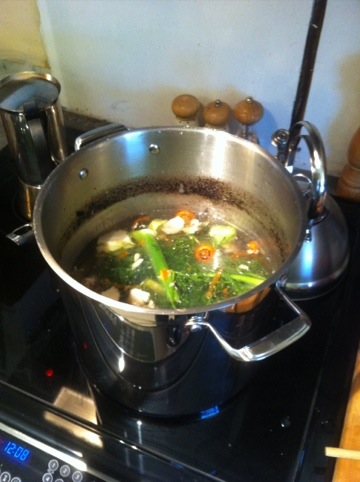 On ajoute aussi de vieilles retailles de légumes amassés au courant de la semaine, pour ajouter du goût. Sinon, c’est une bonne idée d’y ajouter une couple de carottes et d’oignons…