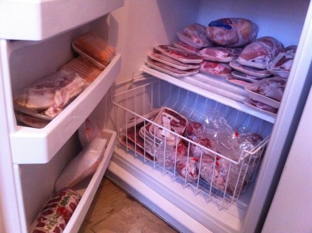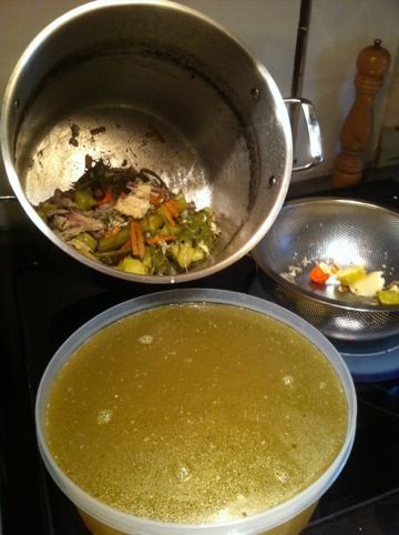 Nous mettons le résultat au frigo pour enlever un peu de gras… Et on peut congeler le bouillon en portions d’un litre environ, pour usage ultérieur (comme des soupes).