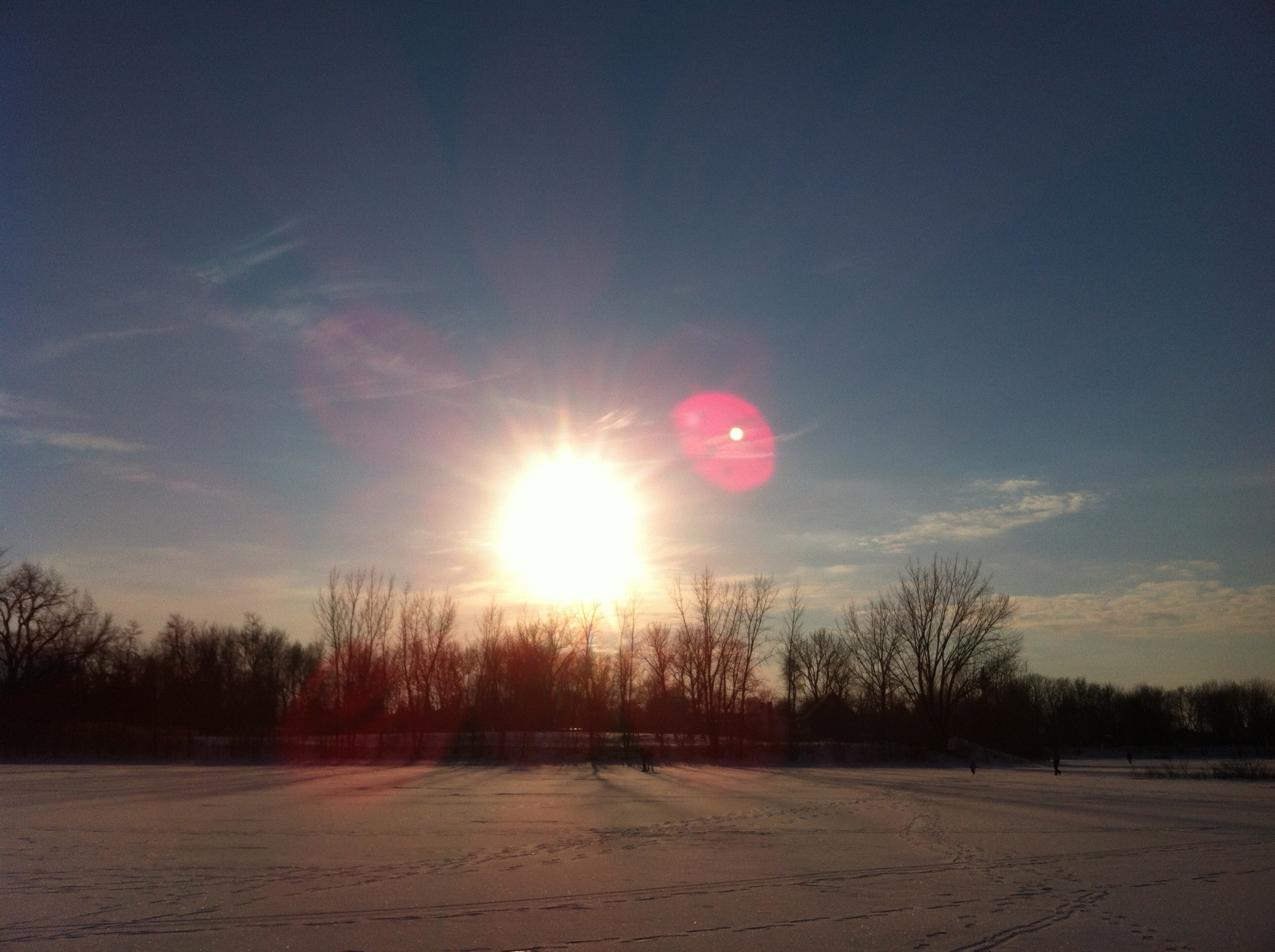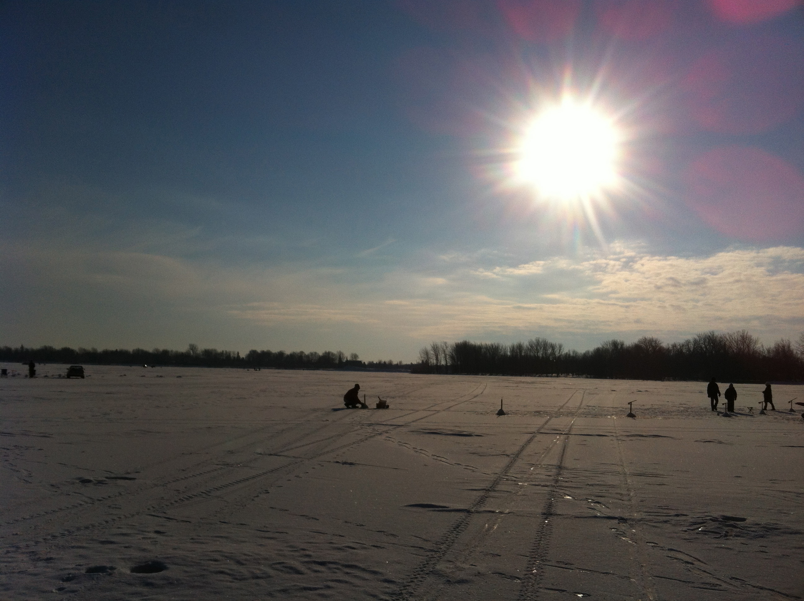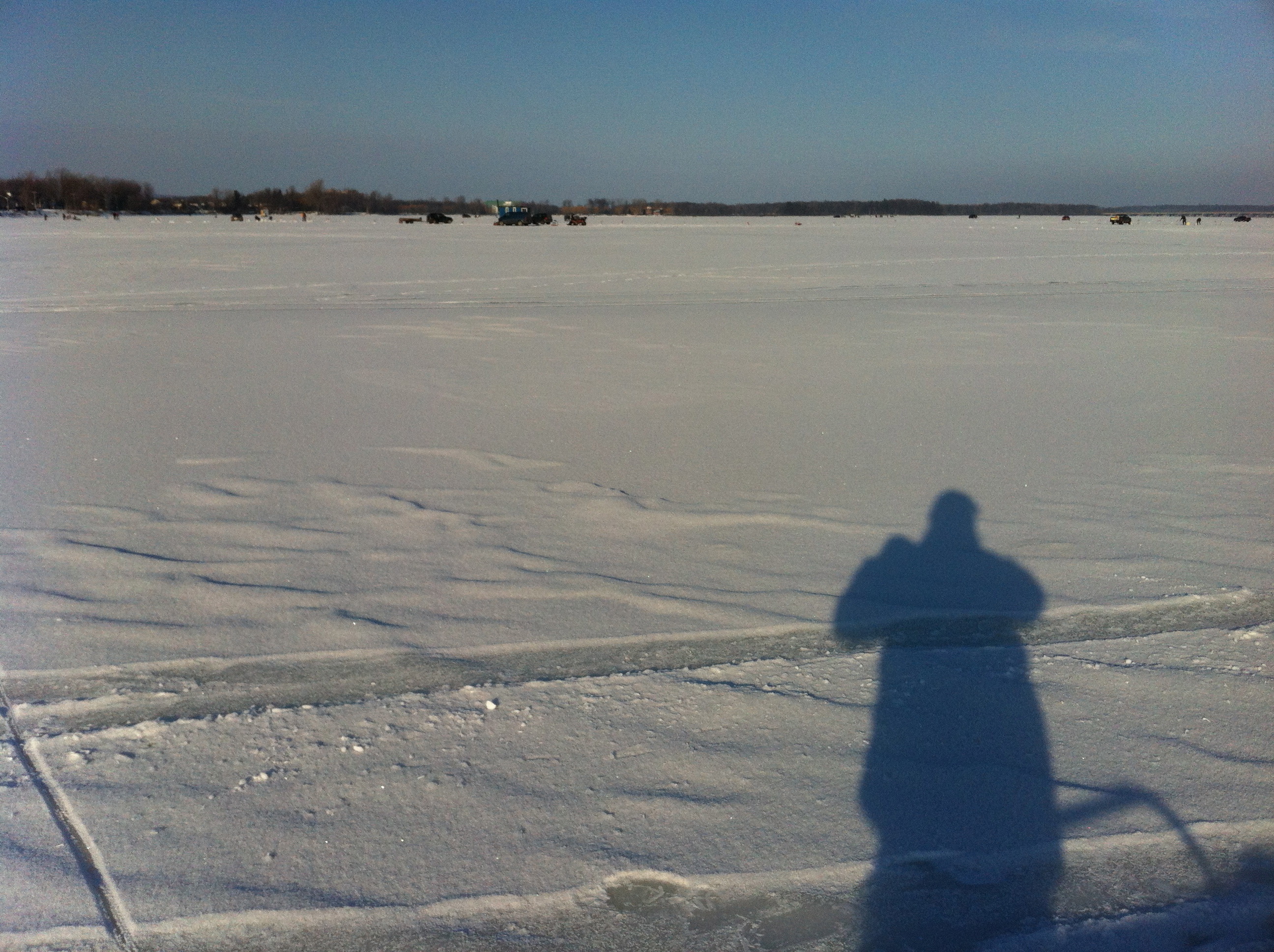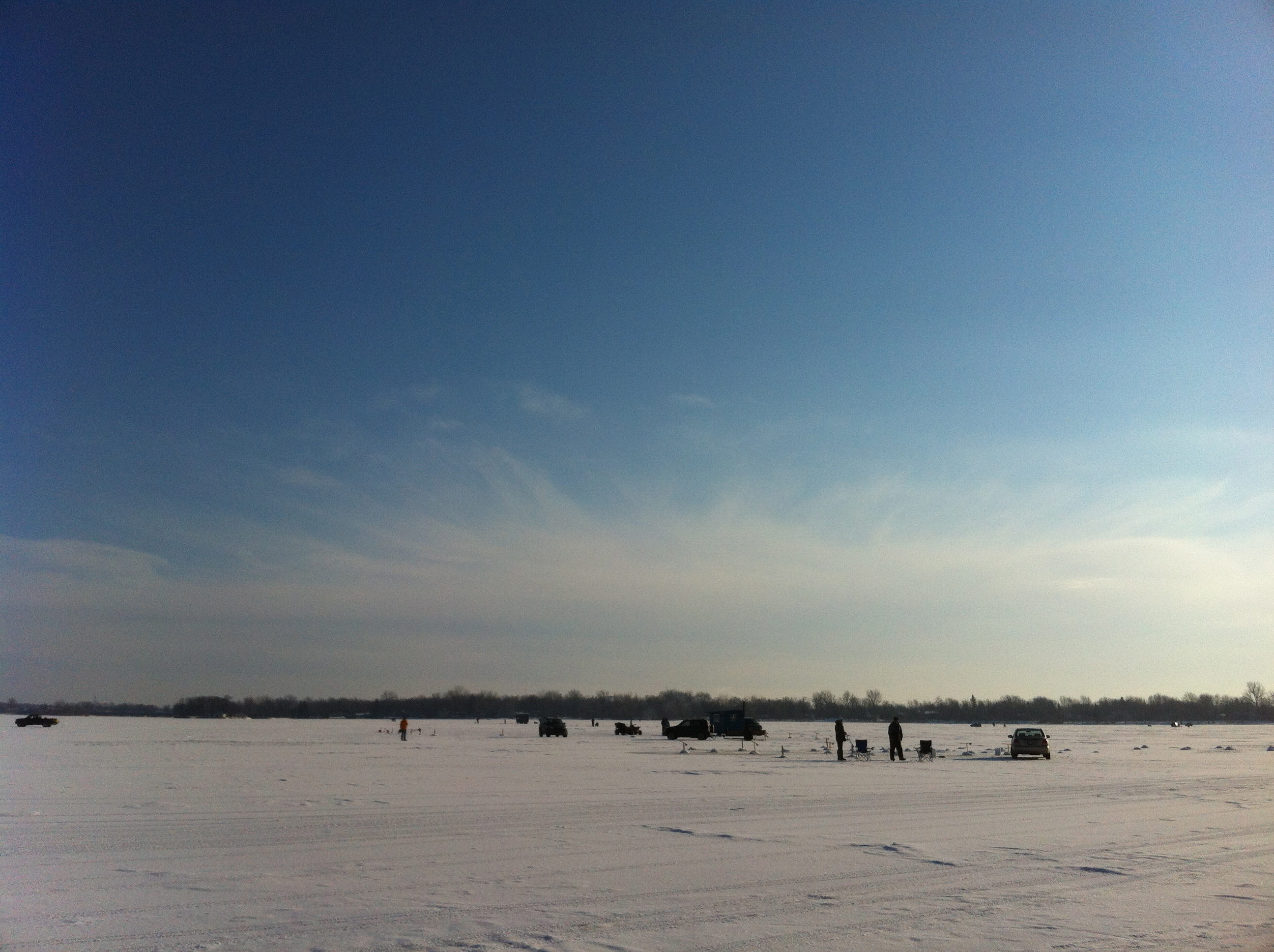 Ladite glace était parfaitement lisse, tellement que plusieurs intrépides patineurs ont mené leur voiture au milieu de la baie et ont pelleté la fine couche de glace pour se frayer une patinoire improvisée. Badaud, hypnotisé par la lumière surréelle jumelé à la température clémente, je me croyais à la plage, si ce ne fut de mes habits et tout ce blanc qui tapissait le paysage.
