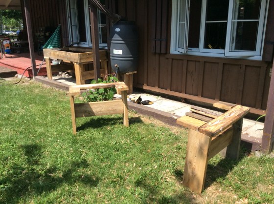 Le bas est en pruche, le reste en mélèze. Les pattes sont 2 pieds de haut et les bacs seront 30 pouces de large (extérieur). Donc, ça me prend le bois suivant: