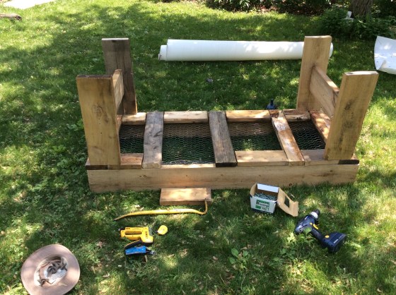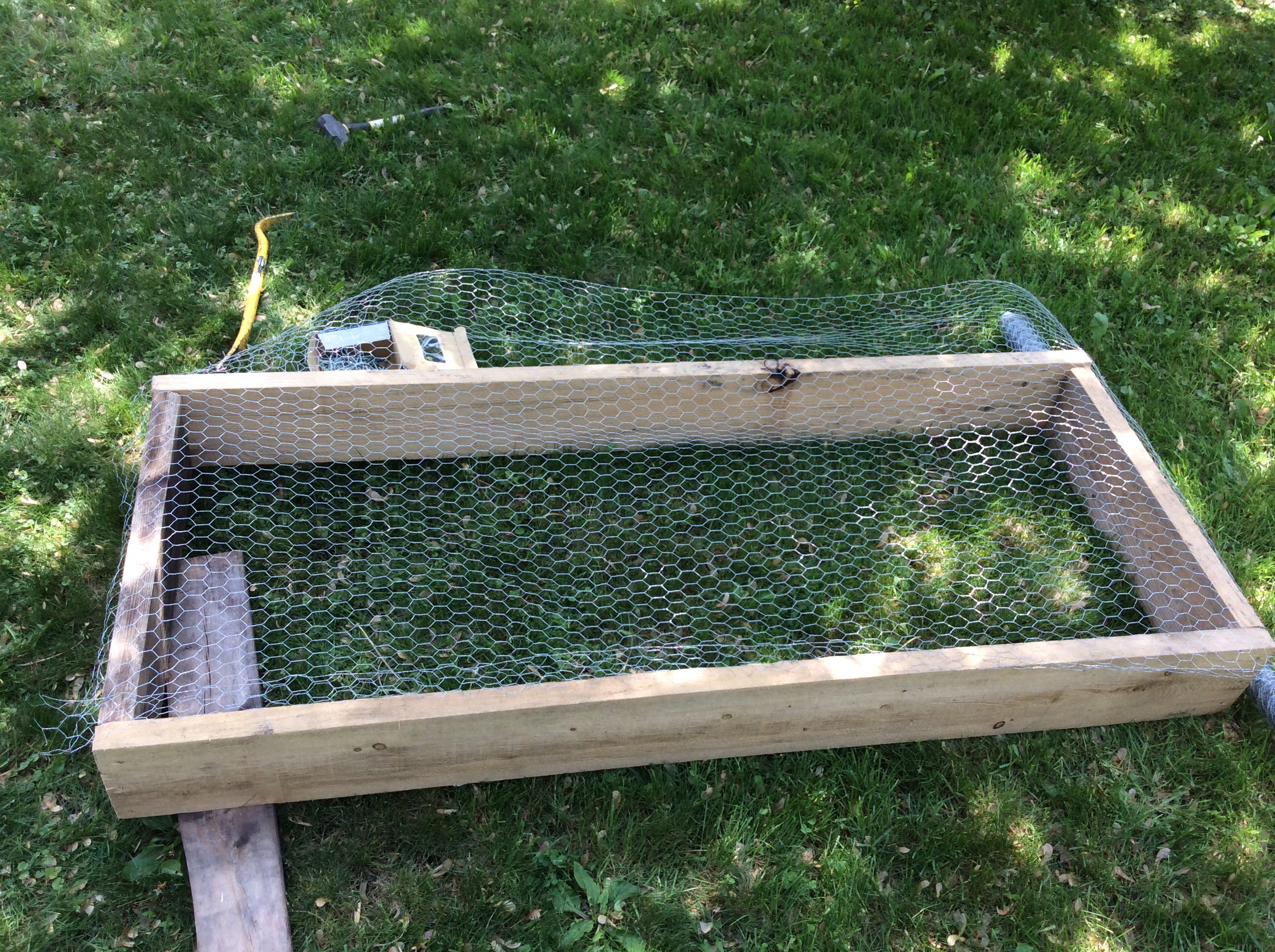 J’avais un restant de broche à poule (que j’ai utilisé pour bâtir une clôture autour de notre potager) alors je l’ai mis dans le fond pour solidifier la structure. Je l’ai brochée pour la tenir en place, en prenant soin de doubler les bords pour que ça soit plus solide.