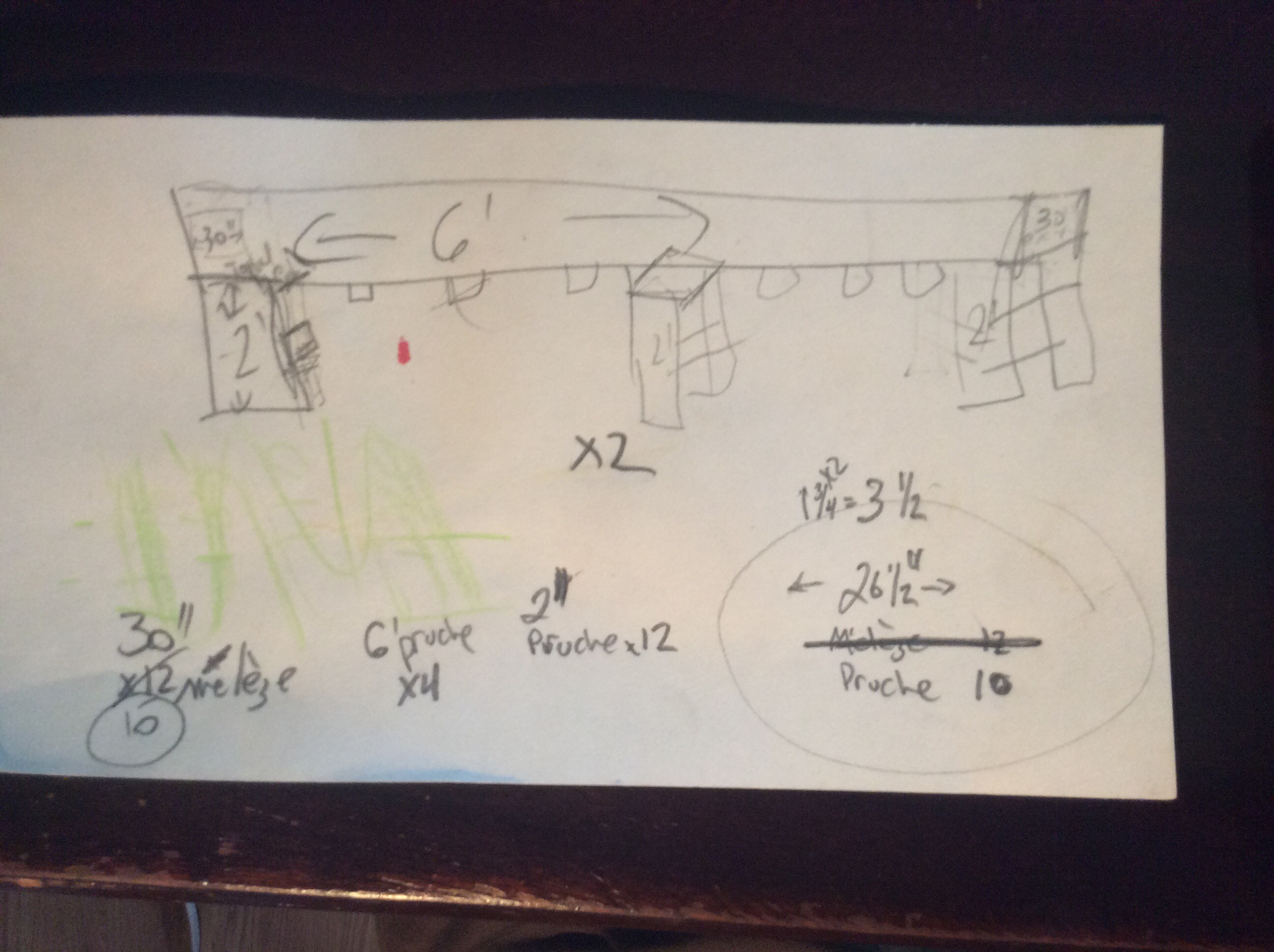 Pruche: 4 morceaux de 2 pieds (pour les pattes) et 4 morceaux de 26 et demi pour les travers (j’utilise du bois non plané, alors il est un peu plus large). 2 morceaux de 6 pieds pour les côtés.